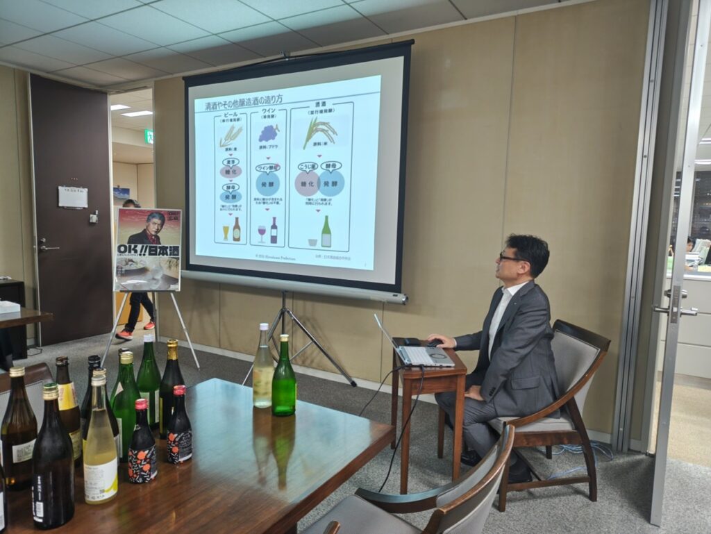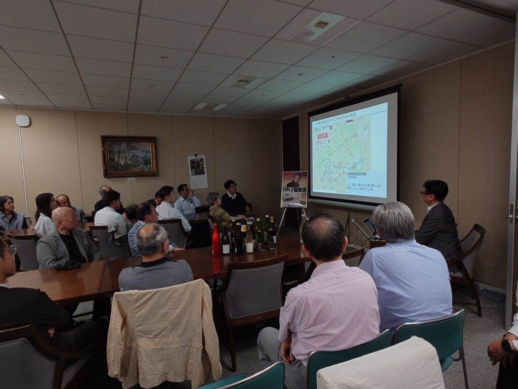 第1部では、大土井様から広島県が発表した新しい酵母「ひろしま LeG-爽(れぐそう)」、新しい原料米である「萌えいぶき」、新しい精米方法である「扁平・原形精米」等について、実際にお酒を試飲しつつお話を伺いました。